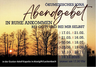Am 17.10.25 um 17.30 Uhr findet das nächste ökumenische Abendgebet in der Gustav-Adolf-Kapelle statt.